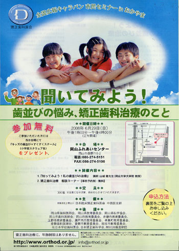 大雨予報の間隙をぬって、6月29日岡山ふれあいセンターで行われた「市民セミナー in おかやま」に参加し、歯並び相談を担当してきました。岡山大学教授の山城 隆 先生の講演と矯正歯科専門医による歯並び相談が行われ、380名を超える方々のご来場を頂きました。今年で3回目になるこのキャラバンも年々充実して来ているように思います。 このセミナーを主催している日本臨床矯正歯科医会とは? 日本臨床矯正歯科医会(矯正歯科医会)は、5年以上の矯正歯科臨床経験を有し、矯正歯科を専従とし、所在地区会員1名を含む会員3名以上の推薦を受けた矯正歯科医で構成されている団体です。 矯正歯科医会は、矯正歯科のプロフェッショナル団体で、「よい咬み合わせときれいな歯ならびによって心身の健康を育む」を治療目的とし、見た目の美しさだけではなく、咬み合わせの改善、咀嚼(そしゃく)機能の向上、口全体の健康増進など、総合的に取り組んでいます。 |